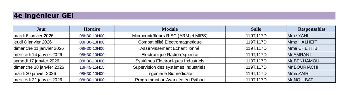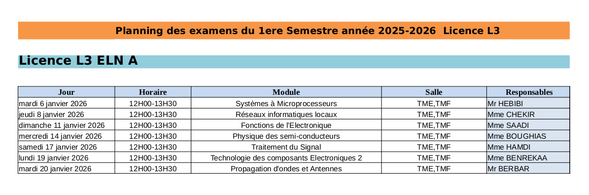 Planning des Examens du 3ème Année Licence ELN section A