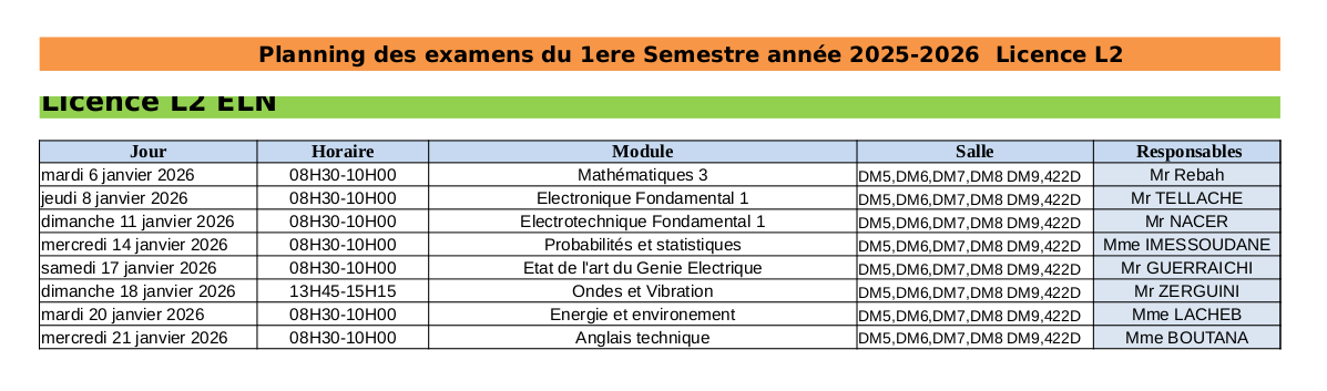 Planning des Examens du 2ème Année Licence ELN section A
